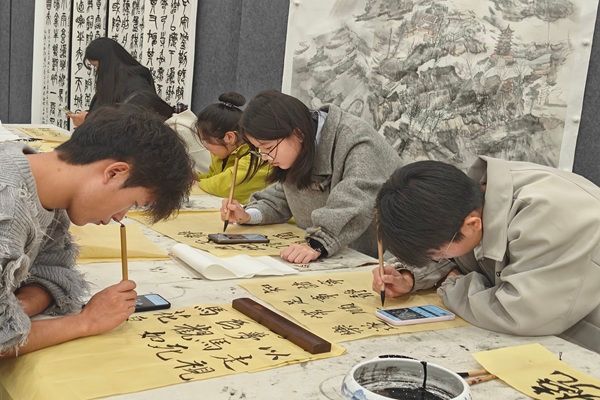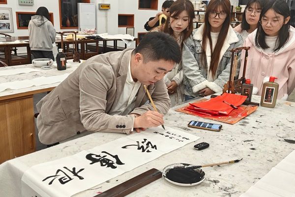 2025年11月15日晚6:30-8:30,在内江师范学院中华传统书画文化研究院二楼书画传习工坊,内江师范学院书法协会特邀宋学勤老师参加第11周“书法沙龙”,为会员同学讲授书法基础知识并示范“四字吉语”的集字创作要领。