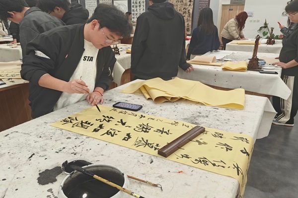 在统一教学结束后,宋老师开启针对学生问题的个性化讲解模式。他对同学的书法习作细致审视,既精准点出不足:或是某字结构的疏密失当,或是某行笔锋的藏露欠妥;又真诚肯定优点——对同学们笔法中的独特韵味、结字里的巧妙构思予以赞赏。同时,针对书法创作中四言、七言、对联的不同写法,宋老师也逐一进行指导。讲解四言作品时,强调其端庄规整,指导同学们在结字与布局上追求对称之美;解析七言作品时,突出其灵动舒展,点拨大家在笔势与节奏上营造韵律;传授对联创作时,从上下联的呼应到落款印章的搭配,全方位讲解其章法要点。