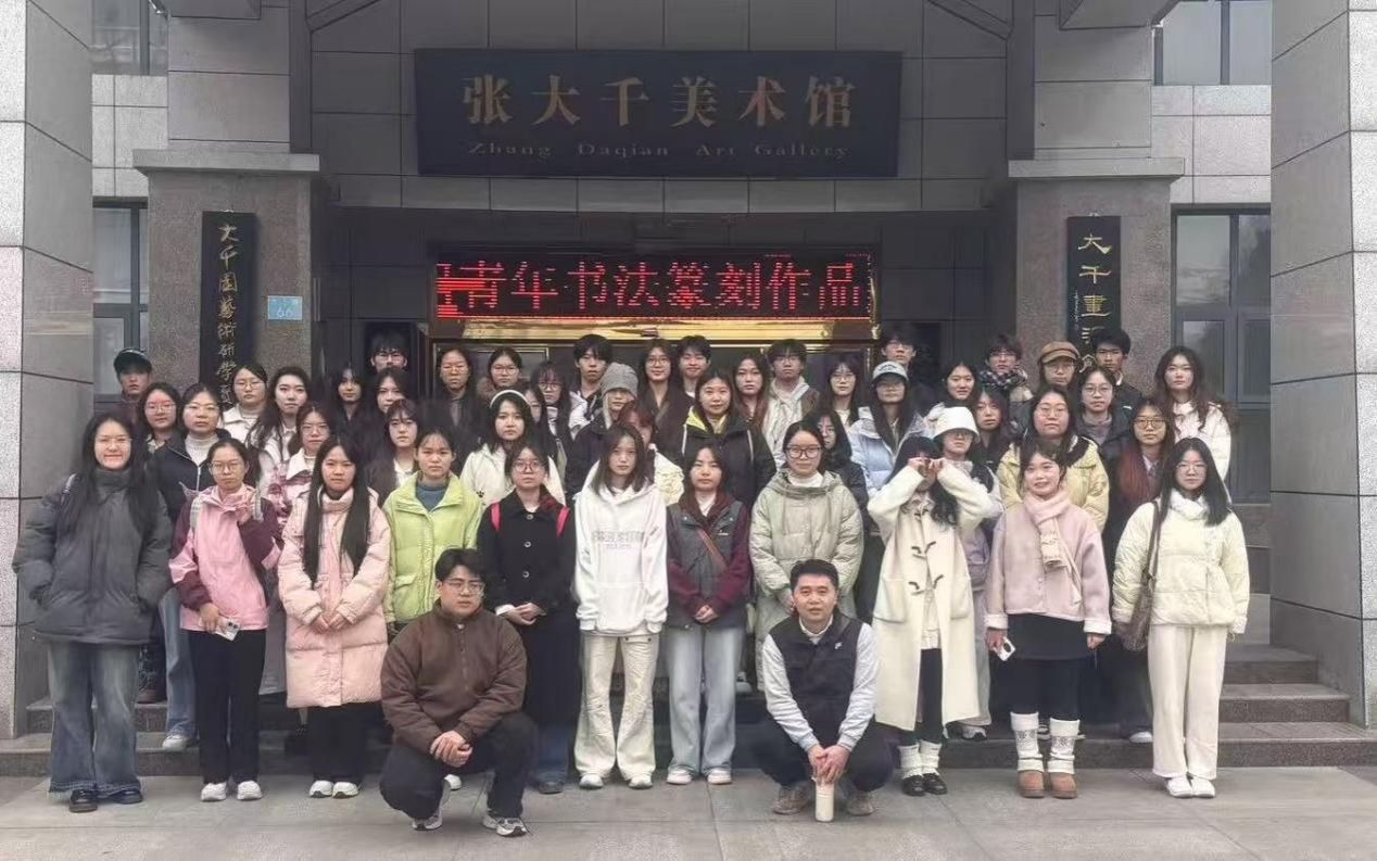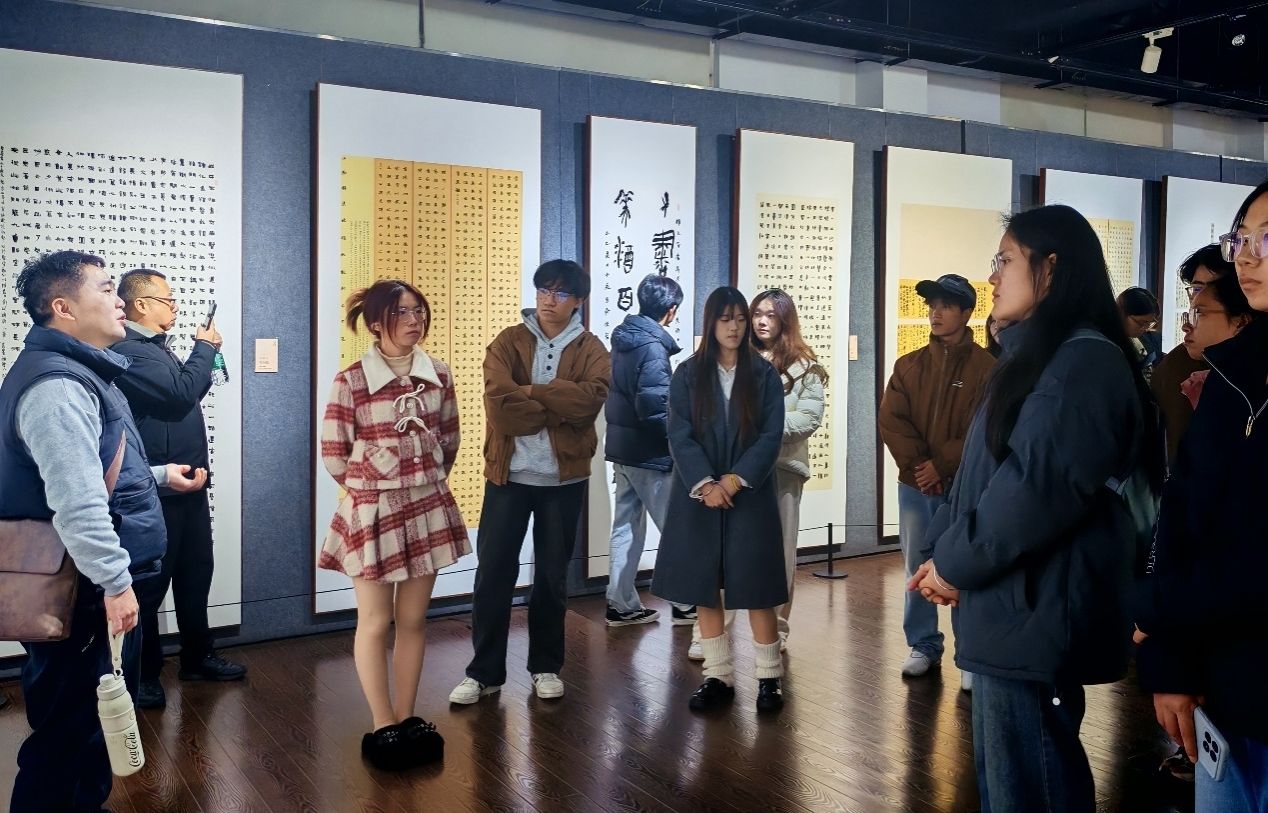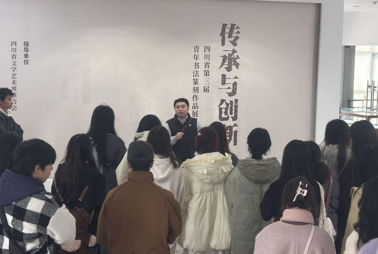 2025年11月30日上午,内江师范学院书法协会约60名成员在中华传统书画文化研究院副教授、中国书法家协会会员宋学勤的带领下,前往张大千美术馆参观“传承与创新——四川省第三届青年书法篆刻作品展”,并开展了一场以展览为载体的现场观摩与教学活动。