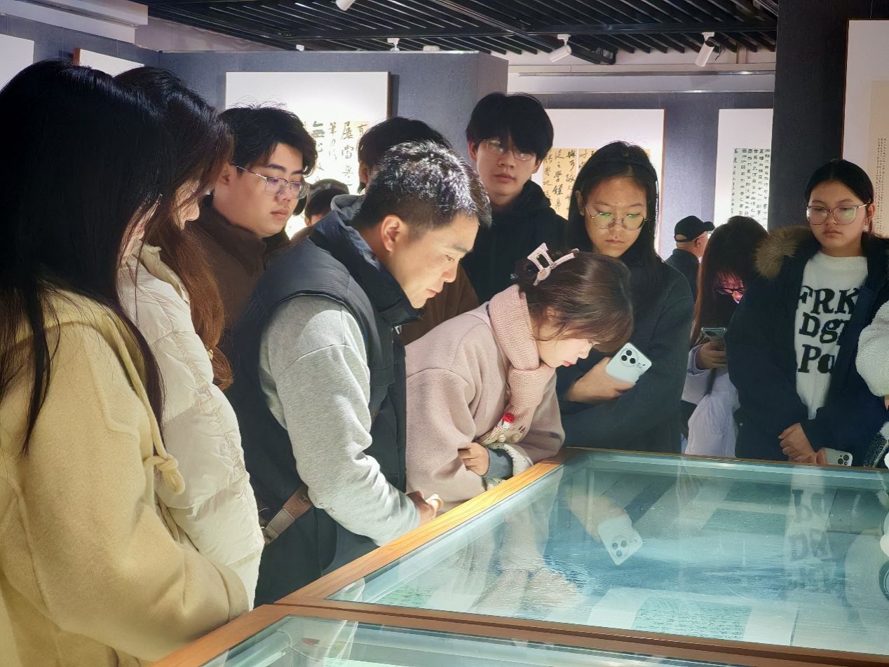 参与学生来自美术、书法、教育、法学、物理、历史等多个专业,活动现场秩序井然,书法艺术氛围浓厚。在宋学勤老师的专业引导下,同学们有序观摩展览作品,聆听老师结合展品进行的系统讲解。宋老师从作品的形式规则、空间布局、笔墨技法等方面展开分析,着重探讨了文本选择、落款经营、印章运用及疏密对比等创作细节,深入阐释书法艺术中“对立统一”的美学理念。同学们沉浸于笔墨世界,认真观察不同书体与篆刻风格,积极交流心得,展现出良好的艺术素养与学习热情。