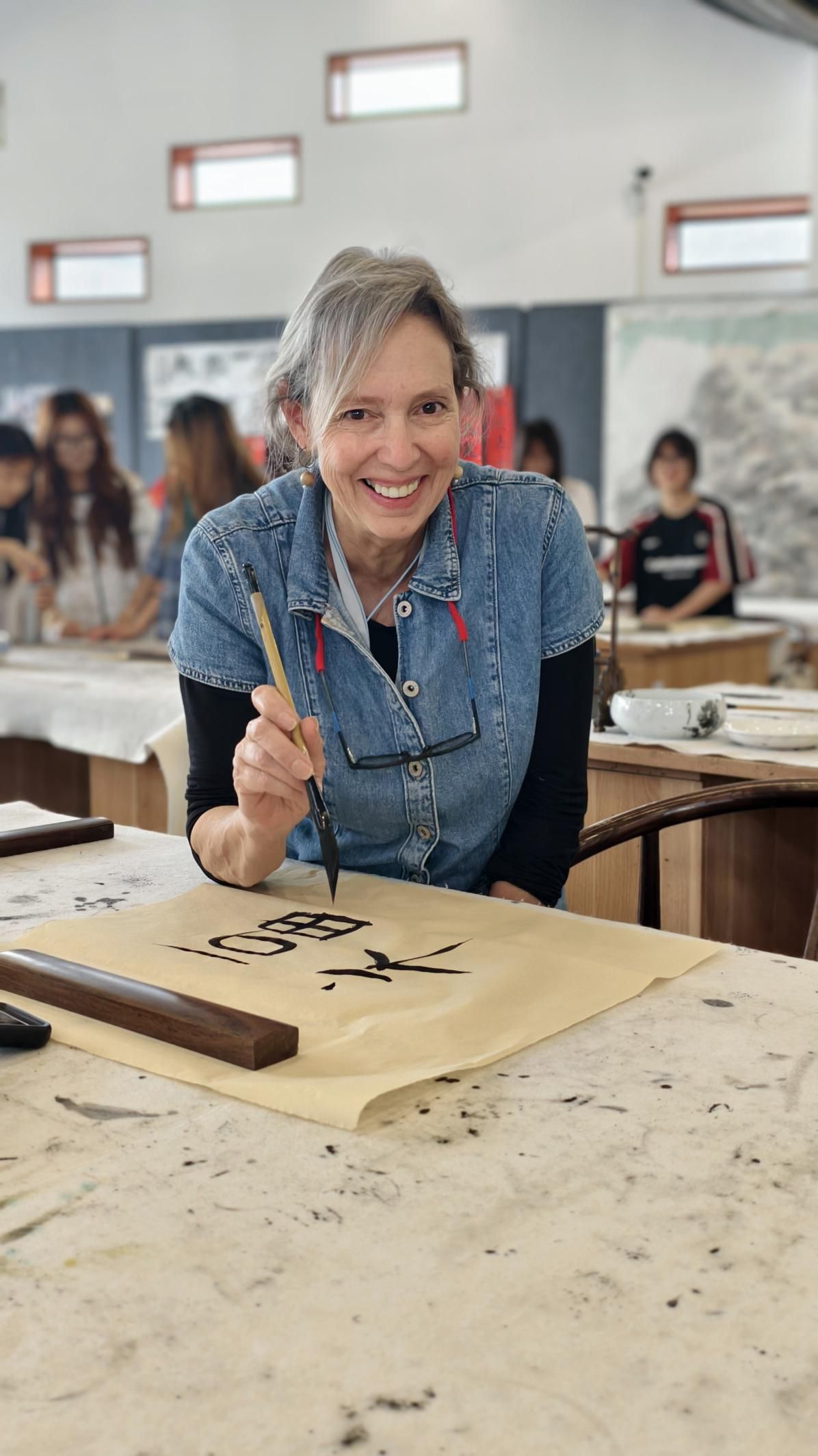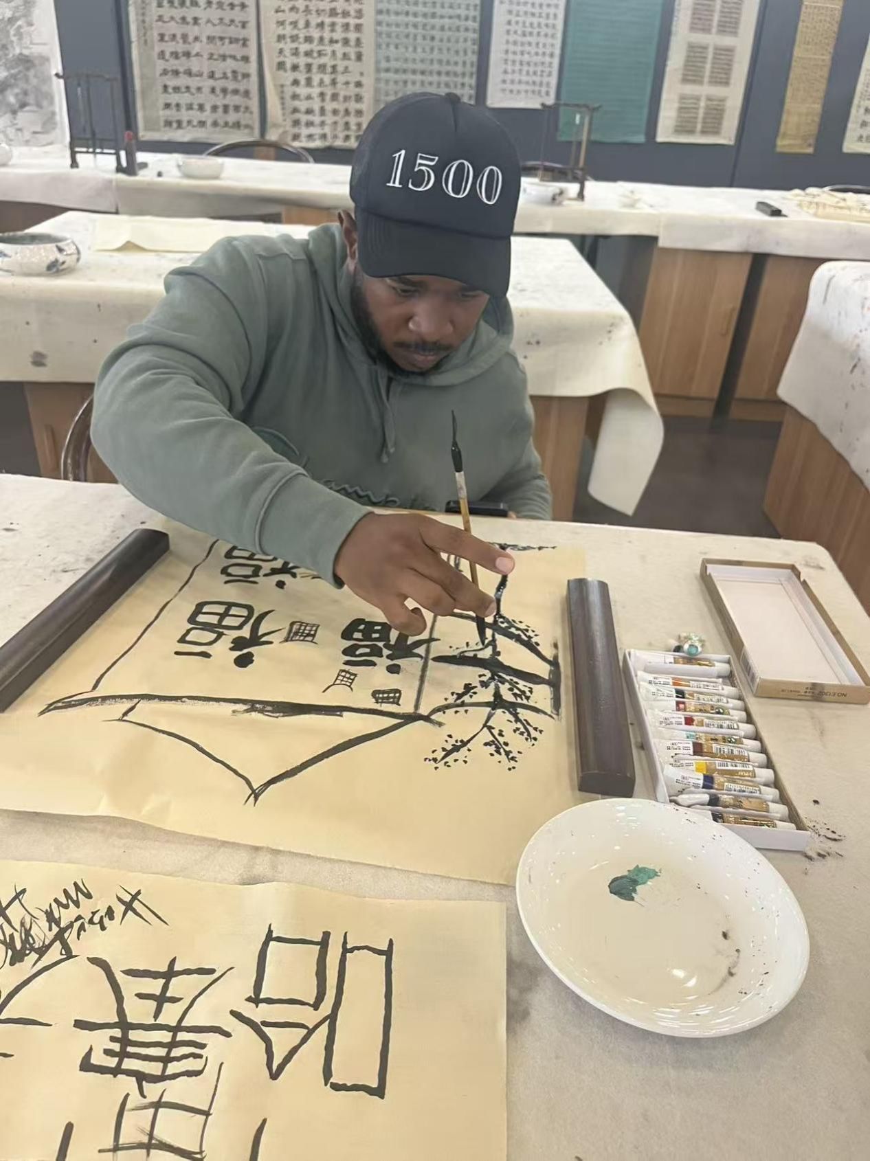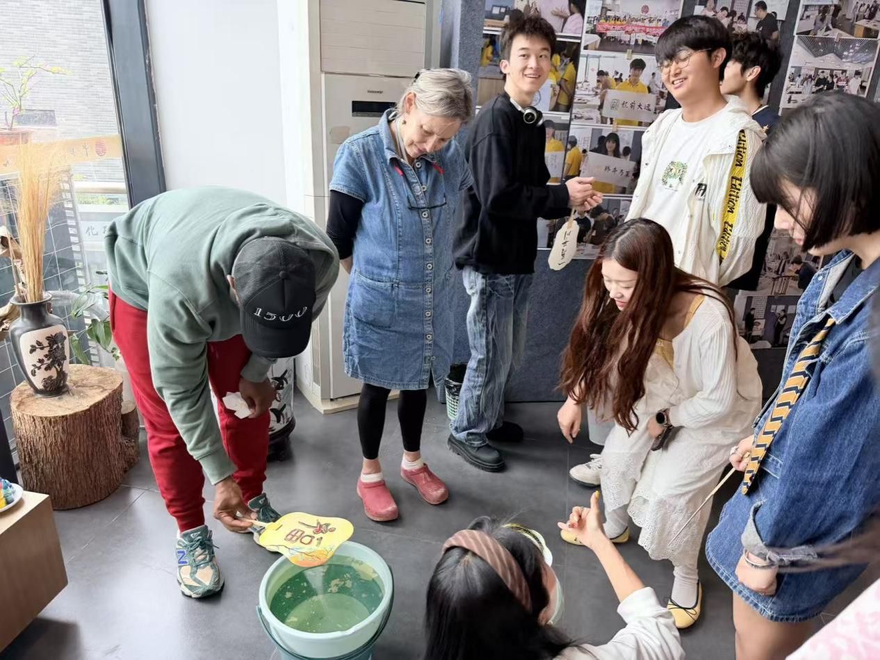 活动伊始,研究院阳金菊,吴明蔚两位老师与4名学生志愿者热情接待了来访师生。活动分为中国传统书画体验与非遗漆扇制作两大环节。首先书法专业志愿者们带领大家在笔墨与色彩中感受中国传统艺术的独特魅力,随后卢玥雪老师指导学生们进行漆扇制作。在轻松而充实的氛围中,Rebecca、Hasef两位外教表示通过亲手书写心愿、制作漆扇,不仅加深了对中国传统艺术的理解,更感受到了学校师生热情友好的氛围。视觉传达专业的同学们也在与外国友人的互动中,锻炼了跨文化沟通能力,收获了别样的创作灵感。